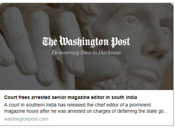 இந்த நிலையில் இந்த கைது குறித்தும், கட்டுரை குறித்தும் விரிவான கட்டுரை அமெரிக்க நாளிதழில் வந்துள்ளது. தி வாஷிங்டன் போஸ்ட் நாளிதழில் விரிவான கட்டுரை வெளியாகி உள்ளது. நக்கீரன் கோபால் பெயரும், அந்த கட்டுரை குறித்த விவரமும், கைது செய்யப்பட்டு விடுதலை செய்யப்பட்டதும் சொல்லப்பட்டுள்ளது.