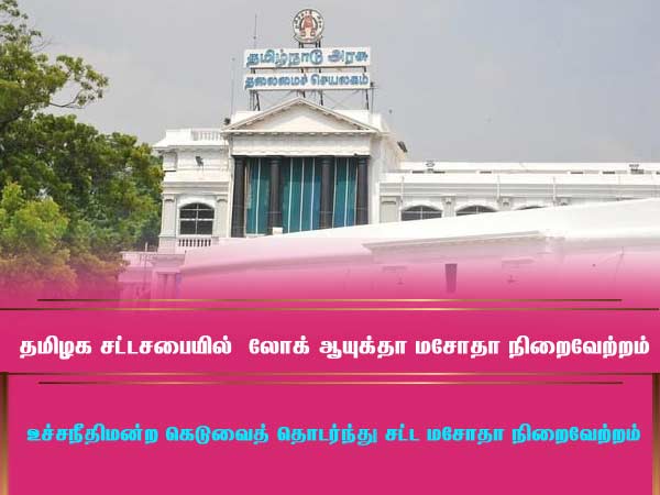 மே 29-ஆம் தேதி தொடங்கிய நடப்பு சட்டசபை கூட்டத்தொடர், இன்றுடன் முடிவடைகிறது என்பது குறிப்பிடத்தக்கது. இந்த லோக் ஆயுக்தா மசோதாவை அமைச்சர் ஜெயக்குமார் தாக்கல் செய்தார். எதிர்க்கட்சிகள் யாரும் மசோதாவிற்கு எதிர்ப்பு தெரிவிக்கவில்லை.