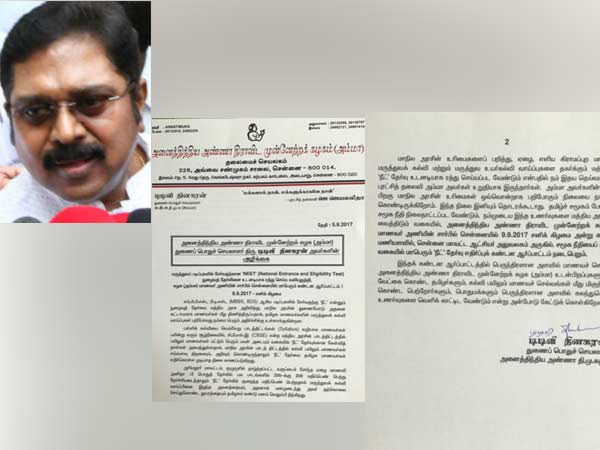 இது தொடர்பாக தினகரன் வெளியிட்டுள்ள அறிக்கையில் கூறியிருப்பதாவது : எம்பிபிஎஸ், பிடிஎஸ் ஆகிய படிப்புகளில் சேர்வதற்கு நீட் என்னும் நுழைவுத் தேர்வை மத்திய அரசு அறிவித்து, மாநில அரசின் துணையோடு அதனை கட்டாயமாக மாணவர்கள் மீது திணித்திருக்கிறது. தமிழக மாணவர்களின் மருத்துவக் கல்வி வாய்ப்புகள் பறிபோவது நம்மை அதிர்ச்சியடைய வைத்துள்ளது.