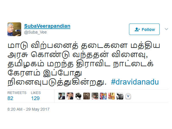 மாடு விற்பனைத் தடைகளை மத்திய அரசு கொண்டு வந்ததன் விளைவு, தமிழகம் மறந்த திராவிட நாட்டைக் கேரளம் இப்போது நினைவுபடுத்துகின்றது என்று திராவிடர் இயக்க தமிழர் பேரவை தலைவர் சுபவீ டுவிட்டரில் பதிவிட்டுள்ளார்.