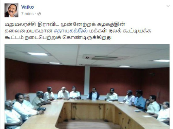 அந்தப் பதிவில், மறுமலர்ச்சி திராவிட முன்னேற்றக் கழகத்தின் தலைமையகமான தாயகத்தில் "மக்கள் நலக் கூட்டியக்க கூட்டம்" நடைபெற்றுக் கொண்டிருக்கிறது எனக் குறிப்பிட்டு படத்தை வெளியிட்டிருக்கிறார்.