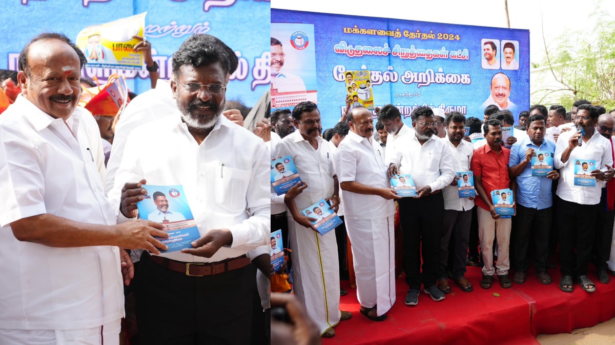 சிதம்பரம்: தமிழ்நாட்டுக்கு தனி கொடி அனுமதிக்கப்பட வேண்டும்; ஆளுநர் பதவியை ஒழிக்க வேண்டும். எஸ்சி, எஸ்டி-க்கு தனி வங்கி உருவாக்கப்பட வேண்டும் என்பது உள்ளிட்ட வாக்குறுதிகளுடன் விடுதலை சிறுத்தைகள் கட்சியின் லோக்சபா தேர்தலுக்கான தேர்தல் அறிக்கை இன்று வெளியிடப்பட்டுள்ளது.