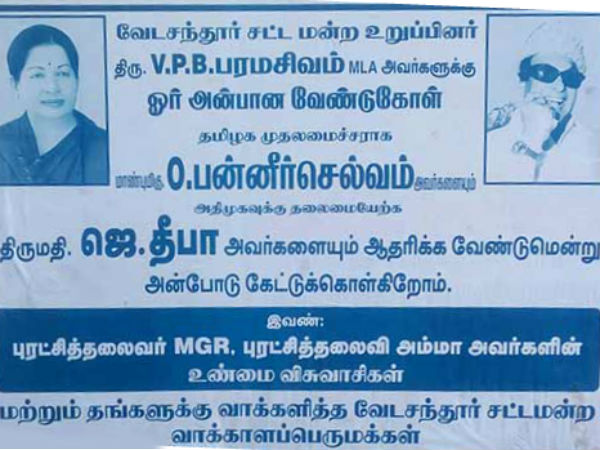 இது ஒருபுறம் இருக்க, வேடசந்தூர் தொகுதி வாக்காள பெருங்குடி மக்கள் தாங்கள் விரும்பியதை அழகான போஸ்டரில் அச்சடித்து வெளிப்படுத்தியுள்ளனர். பொதுமக்கள் ஒட்டியுள்ள சுவரொட்டியில், தமிழக முதல்வராக ஓபிஎஸ்ஸுக்கும், அதிமுகவின் தலைவராக தீபாவிற்கும் ஆதரவளிக்க வேண்டும் என்றும் இந்தத் தொகுதியின் எம்எல்ஏவிற்கு அன்பு வேண்டுகோளை விடுத்துள்ளனர்.