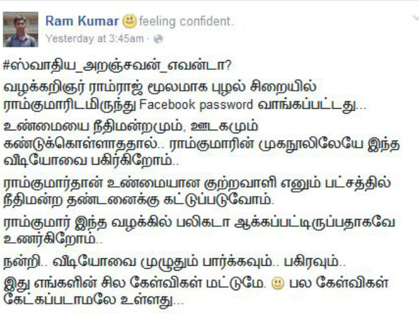 இவர் ராம்குமாரின் பேஸ்புக் பாஸ்வேர்டை அவரது வழக்கறிஞரான ராமராஜ் மூலம் சிறையில் இருக்கும் ராம்குமாரிடம் இருந்து பெற்று, ஸ்வாதிய அறஞ்சவன் எவன்டா? என்ற வீடியோவை பதிவிட்டு பரபரப்பை ஏற்படுத்தியுள்ளார்.