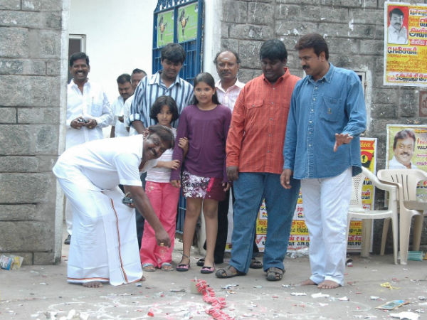 தனது வீட்டுக்கு வெளியே மகன்கள், குடும்பத்தாருடன் வந்த விஜயகாந்த் சற்றும் பயப்படாமல் பல்வேறு வகையான சர வெடிகளை கொளுத்திக் கலக்கினார்.