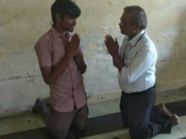 இந்நிலையில் பிளஸ் 2 படிக்கும் மாணவர் ஒருவர் முறையாக பள்ளிக்கு வராததை அறிந்த பாலு, அவரிடம் பள்ளிக்கு ஏன் வரவில்லை என்று கேட்டார். அப்போது யாரும் எதிர்பார்க்காத நிலையில் மாணவரிடம் மண்டியிட்டு பள்ளிக்கு வந்து ஒழுங்காக கல்வி கற்க வேண்டும் என்று அறிவுரை கூறினார்.