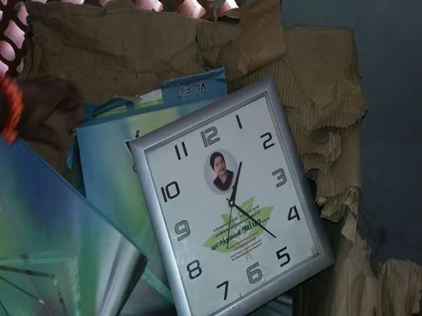 அப்போது, 18 அட்டைப் பெட்டிகளில் சுவர் கடிகாரங்கள் பதுக்கி வைக்கப்பட்டிருந்தது. அதை சோதனை செய்தபோது அந்த கடிகாரங்களில் தமிழக முதல்வர் ஜெயலலிதா படம், இரட்டை இலை சின்னம் ஆகியவற்றுடன் வி.செந்தில்பாலாஜி, மாவட்டச் செயலாளர், போக்குவரத்துத் துறை அமைச்சர் என அச்சிடப்பட்டுள்ளது.