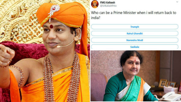 இந்நிலையில், தான் இந்தியாவுக்கு திரும்பும்போது பிரதமராக யார் இருக்க முடியும் என்று ஒரு கேள்வியை எழுப்பி, அதை தனது பிஎம்ஓ கைலாசா (கைலாசா பிரதமர் அலுவலக அபீஷியல் டிவிட்டர் ஹேன்டிலாம் இது) ட்விட்டர் அக்கவுண்டிலும் நித்யானந்தா பதிவிட்டுள்ளார். அந்த ட்விட்டருக்கு கருத்து கேட்டு வாக்களிக்கவும் வேண்டுகோள் விடுத்துள்ளார்.