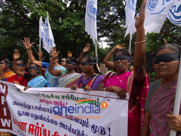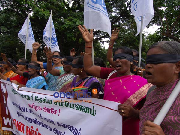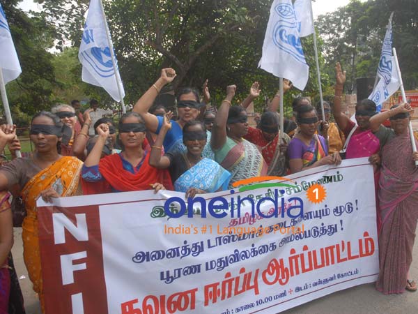 இந்த நிலையில் சென்னையில் இன்று வள்ளுவர் கோட்டம் அருகே இந்திய மாதர் தேசிய சம்மேளனம் அமைப்பின் சார்பில் பெண்கள் கலந்து கொண்ட போராட்டம் நடந்தது. இதில் கலந்து கொண்ட பெண்கள், கண்களை கருப்புத் துணியால் கட்டிக் கொண்டு முழுமையான மது விலக்கை தமிழகத்தில் அமல்படுத்த வேண்டும் என்று கோஷமிட்டு போராட்டம் நடத்தினர்.