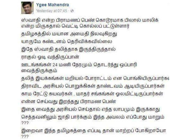 கொலை செய்யப்பட்ட சுவாதி ஒரு பிராமணப் பெண் என்பதால் யாரும் இதைக் கண்டுகொள்ளவில்லை எனவும், இதுவே அவர் ஒரு தலித்தாக இருந்திருந்தால் எல்லோரும் வரிந்துகட்டிக்கொண்டு பேசியிருப்பார்கள் என அந்த ஃபேஸ்புக் பதிவில் கூறப்பட்டு உள்ளது.