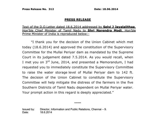 முல்லைப் பெரியாறு அணை விவகாரத்தில் உச்ச நீதிமன்றம் 7-5-2004 அன்று பிறப்பித்த உத்தரவிற்கிணங்க, மேற்பார்வைக் குழு அமைக்க மத்திய அமைச்சரவை முடிவு செய்திருப்பதற்காக உங்களுக்கு நன்றி தெரிவிக்கிறேன்.