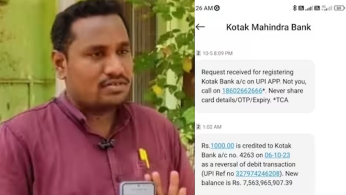 தஞ்சாவூர் மாவட்டம் பூதலூர் பகுதியை சேர்ந்த 29 வயதாகும் கணேசன் என்பவர் அந்த பகுதியில் உள்ள தனியார் நிறுவனத்தில் வேலை பார்க்கிறார். கோட்டக் மஹிந்திரா வங்கி கணக்கில் இருந்து ரூ.1,000 ஐ கணேசன் தனது நண்பர் ஒருவருக்கு டிரான்ஸ்பர் செய்துள்ளார். பணம் டிரான்ஸ்பர் ஆன பின்னர் அவர் வங்கி கணக்கில் ரூ.756 கோடி ரூபாய் மீதம் இருப்பதாக அவருக்கு எஸ்எம்எஸ் வந்திருக்கிறது.