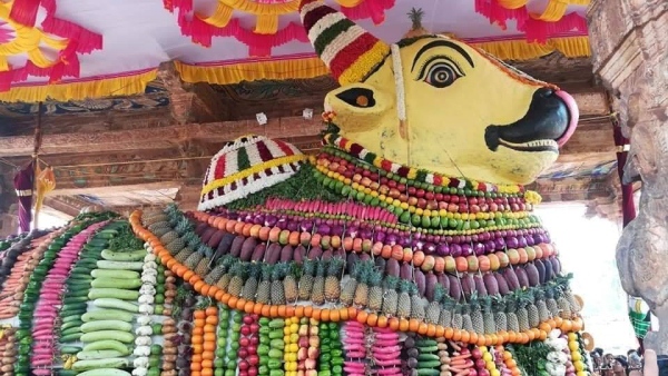 மாட்டுப்பொங்கல் பண்டிகையையொட்டி இன்றைய தினம் காலையில் பலவித வாசனை திரவியங்களால் சிறப்பு அபிஷேகங்கள் நடைபெற்றன. சவ்சவ், உருளைக்கிழங்கு, கத்தரிக்காய், முட்டைகோஸ், பூசணிக்காய், வாழைக்காய், பாகற்காய், கேரட், மிளகாய், நெல்லிக்காய், வெண்டைக்காய் போன்ற பல்வேறு வகையான காய்கறிகளாலும் பிரம்மாண்ட நந்தியின் கழுத்தை சுற்றிலும் அலங்கரிக்கப்பட்டது.
