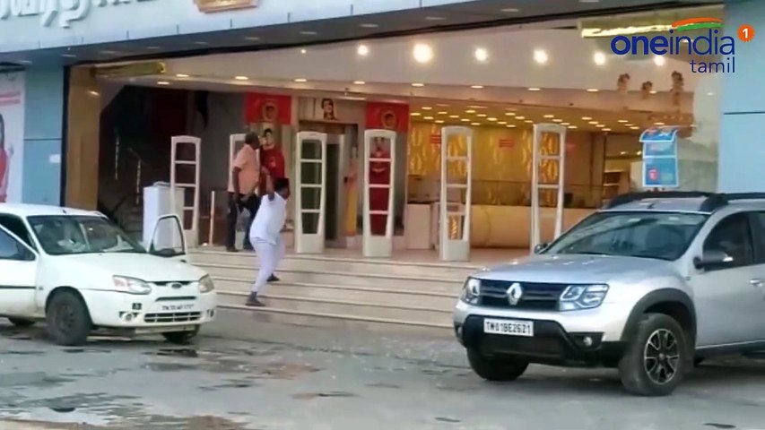 ஆனால் சில ரவுடிகள் இங்கு திடீரென அரிவாளுடன் புகுந்து கண்ணாடிகளை உடைத்து அட்டகாசம் செய்துவிட்டனர். இதனால் அங்கிருந்த கடை ஊழியர்கள், பொதுமக்கள் சிதறி ஓடினார்கள். பின்னர் அந்த ரவுடிகள் தாங்கள் வந்த காரில் ஏறி பறக்க முயன்றனர்.