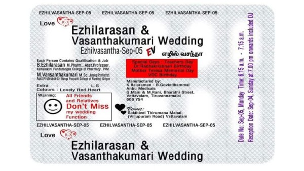 திருமண அழைப்பிதழ்கள் பொதுவாக இரண்டு காரணங்களுக்காக பயன்படுகின்றன. ஒன்று திருமணம் குறித்த தகவல்களை அறிந்துகொள்ள. இரண்டாவது கரன்ட் கட் ஆனா எடுத்து வீசிக்கொள்ள. ஆனால் தற்போதுள்ள இளைஞர்கள் அழைப்பிதழ்களின் இந்த இரண்டு பயன்களையும் கெடுத்துவிட்டதாக பதினாறு பெற்று பெருவாழ்வு வாழ்ந்தவர்கள் புலம்புவதை கேட்க முடிகிறது. ஏனெில் மேலே சொன்னதைப்போல இளைஞர் ஒருவர் தனது திருமண அழைப்பிதழை மாத்திரை அட்டை வடிவத்தில் டிசைன் செய்திருக்கிறார்.