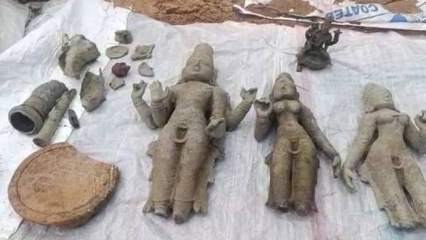 இந்த நிலையில், வெட்டப்பட்ட குழிக்குள் சுமார் 3 அடி உயரம் கொண்ட சிலை, 1 அடி உயரமுள்ள சிலை மற்றும் சிறிய வகை சிலைகள் அடங்கிய உலோக கலையமும் கிடைத்தது.
