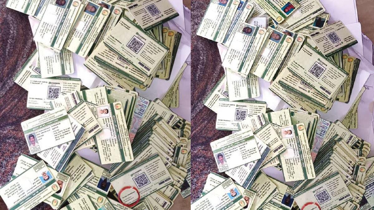 இந்த சூழலில் திருப்பூர் மாவட்டம் பல்லடம் அருகே ஆறுமுத்தாம்பாளையம் ஊராட்சி அறிவொளி நகரில் உள்ள காட்டுப்பகுதியில் குப்பைகள் போடப்பட்டிருப்பது பரபரப்பை ஏற்படுத்தி உள்ளது. இந்த நிலையில் நேற்று அங்கு குப்பை போடச்சென்ற சிலர் குவியல் குவியலாக ஸ்மார்ட் ரேஷன் கார்டுகள் கிடப்பதை கண்டு அதிர்ந்து போனார்கள். இதுகுறித்து நாராணாபுரம் கிராம நிர்வாக அலுவலர் அலுவலகத்திற்கு பொதுமக்கள் தகவல் கொடுத்தனர்.