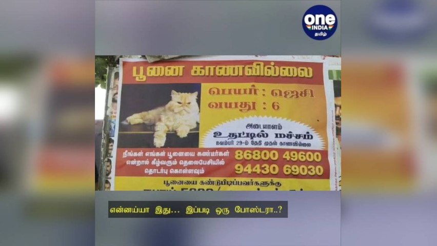 அந்த போஸ்டரில், காணாமல் போன பூனை தொடர்பாக, தகவல் அளித்தாலோ கண்டு பிடித்து கொடுத்தாலோ 5000 ரூபாய் சன்மானம் வழங்கப்படும் என அச்சிடப்பட்டு உள்ளது. மேலும், பூனையின் அடையாளம் குறித்து பதிவிடபட்டுள்ளதை பார்த்து செல்லும் பொதுமக்கள், பூனைக்காக ஒரு போஸ்டரா என ஆச்சரியத்துடன் பார்த்து செல்கின்றனர்.