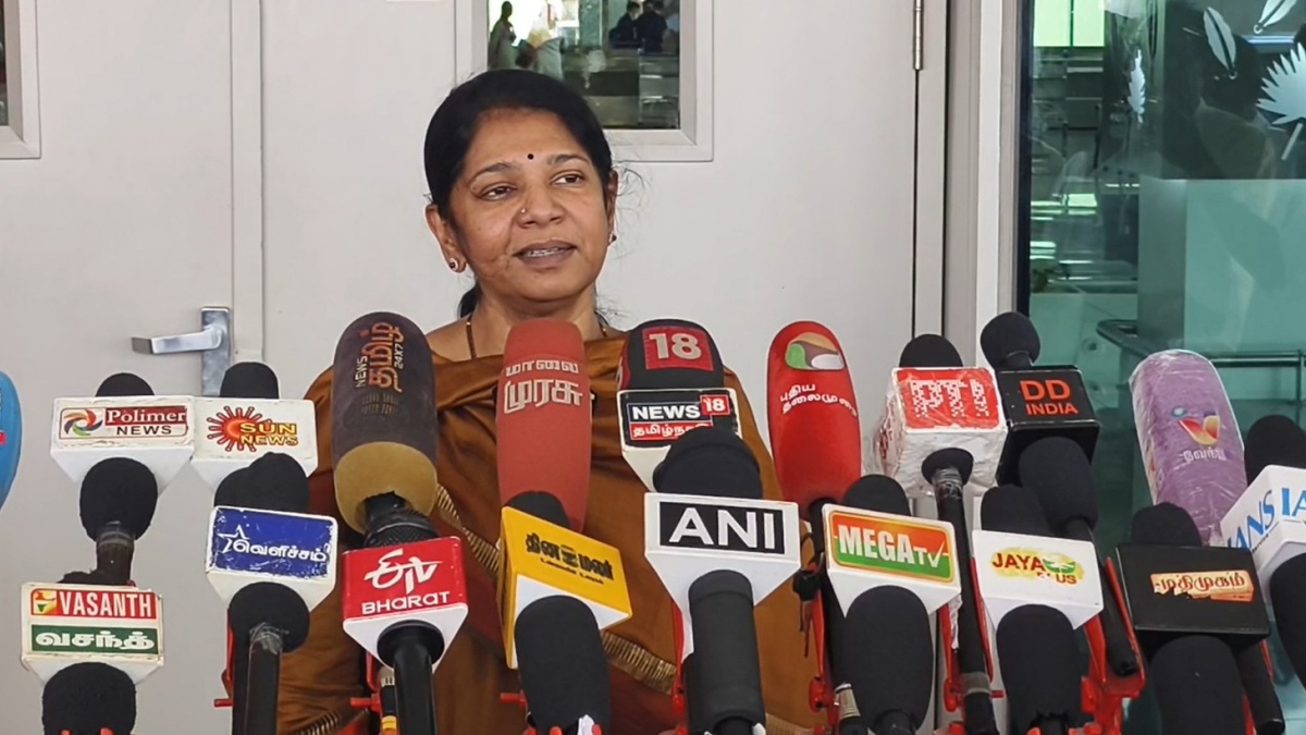 தூத்துக்குடி விமான நிலையத்தில் திமுக துணைப் பொதுச்செயலாளரும், நாடாளுமன்ற திமுக குழுத் தலைவருமான கனிமொழி இன்று செய்தியாளர்களைச் சந்தித்தார்.