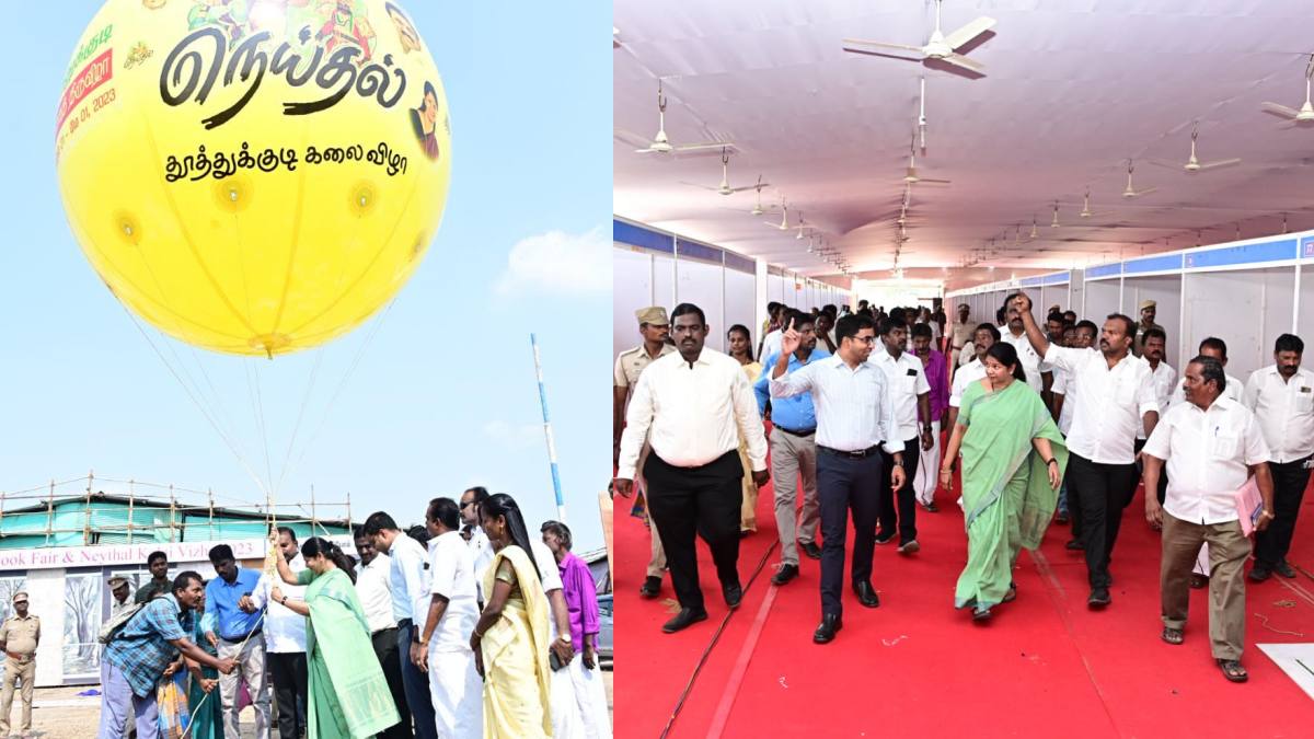 இன்று புத்தகக் காட்சி நடைபெறும் மைதானத்தை பார்வையிட்ட திமுக துணைப் பொதுச்செயலாளர் மற்றும் நாடாளுமன்ற உறுப்பினர் கனிமொழி கருணாநிதி, பிரம்மாண்ட பலுானை பறக்க விட்டு, நெய்தல் விழா குறித்த விளம்பரத்தை தொடங்கி வைத்தார்.