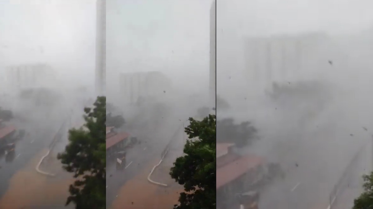 மேலும் அவர் வீடியோ ஒன்றையும் அதில் பதிவேற்றம் செய்துள்ளார். அந்த வீடியோவில் உயரமாக அணிவகுத்து இருக்கும் கட்டடங்கள் தெரிகின்றன. சூறைக்காற்றுடன் கனமழை பெய்யும் நிலையில் மரங்கள் வேகமாக அசைகின்றன. மரத்தில் உள்ள பச்சை இலைகள் காற்றுக்கு தாக்குப்பிடிக்க முடியாமல் உதிர்ந்து மழையோடு பறக்கின்றன.