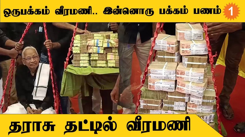 அதாவது கோவில்களில் துலாபாரம் எனப்படும் எடைக்கு எடை காணிக்கை வழங்குவதை போல விடுதலை நாளிதழுக்கு வீரமணியின் எடைக்கு எடை பணக்கட்டுகளை வழங்க முடிவு செய்து இருந்தனர். அதன்படி மேடை அருகே ஒரு பெரிய தராசு அமைக்கப்பட்டு ஒருபுறம் கி வீரமணி அமர வைக்கப்பட்டார். மறுபுறம் பத்து ரூபாய் இருபது ரூபாய், 50 ரூபாய் உள்ளிட்ட நோட்டு கட்டுகள் அடுத்தடுத்து அடுக்கி வைக்கப்பட்டு எடை பார்க்கப்பட்டது.