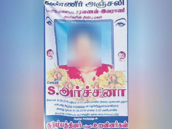 அந்த போஸ்டரில் மகளின் போட்டோ உள்ளது. மேலும், "அன்புமகள் அகால மரணமடைந்துவிட்டாள் என்பதை வருத்தத்துடன் தெரிவித்து கொள்கிறோம், அவளது உடல் இன்று மாலை மயானத்தில் நல்லடக்கம் செய்யப்படுகிறது"என்று எழுதப்பட்டுள்ளது. இந்த போஸ்டரால் ஊருக்குள் பரபரப்பு ஏற்பட்டது.