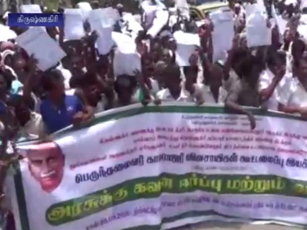 கிருஷ்ணகிரி: தென்பெண்ணை அணையில் இருந்து கும்பளஹல்லி அணைக்கு நீர் திறந்து விடக்கோரி, கிருஷ்ணகிரியில் பெருந்தலைவர் காமராஜர் விவசாயிகள் கூட்டமைப்பு சார்பில் மாபெரும் கவன ஈர்ப்பு ஆர்ப்பாட்டம் நடைபெற்றது. இந்த ஆர்ப்பாட்டத்தில் ஆயிரக்கணக்கான மக்கள் கலந்து கொண்டனர். போதிய மழை இல்லாததால் விவசாயம் பாதிக்கப்பட்டுள்ளதாகவும், கால்நடைகள் வளர்க்க முடியாமல் அவதிப்படுவதாகவும் அவர்கள் வேதனை தெரிவித்தனர்.