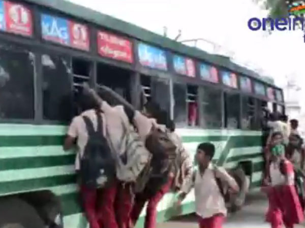 கரணம் தப்பினால் மரணம்... பஸ் படிக்கட்டுகளில் தொங்கியபடி பள்ளி செல்லும் மாணவர்கள்- வீடியோ