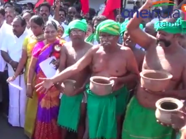 அரை நிர்வாணம், கையில் மண்சட்டி: சாலையில் படுத்து விவசாயிகள் போராட்டம் - வீடியோ