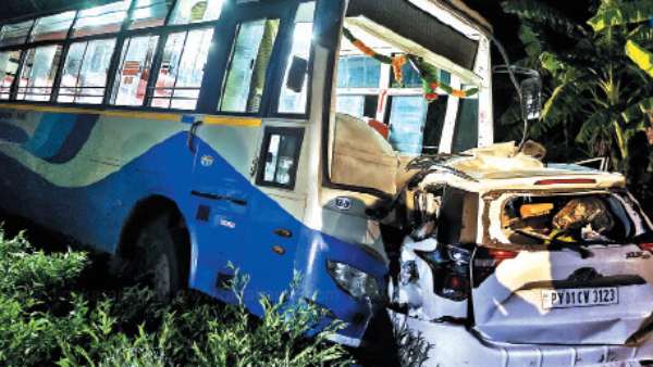 புறவழிச்சாலையோர 8 அடி ஆழ பள்ளத்தில் அரசு பேருந்தின் அடியில் சிக்கிய கார் நொறுங்கியதால் உயிரிழந்தவர்களை மீட்பதற்கு போலீசார் மற்றும் தீயணைப்புத்துறையினர் போராடினர்.