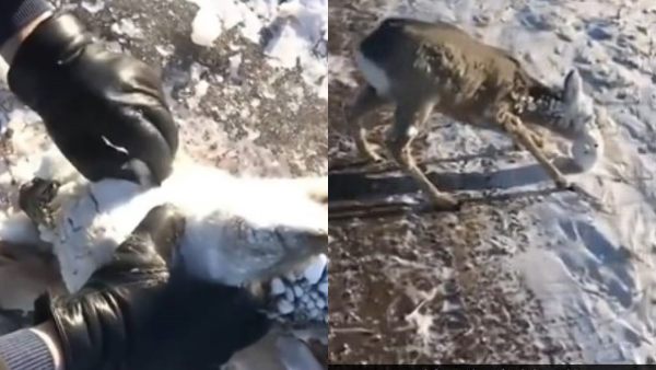பனிக்கட்டியுடன் உறைந்து அவஸ்தை படும் அந்த மானை மலையேற்றத்தில் ஈடுபட்டு இருந்த இருவர் மீட்டுள்ளனர். பனிக்கட்டிகளுக்கு கீழே தனது இரையை தேட முயற்சித்த போது இந்த மான் உறைபனியில் சிக்கியிருக்கலாம் என்று தோன்றுகிறது. இது தொடர்பான டீடியோ ரெட்டிட் சமூக வலைத்தளத்தில் பரவி வருகிறது. ஆனாலும் இந்த வீடியோ எங்கு எடுக்கப்பட்டது என்ற விவரம் இல்லை. அதேவேளையில் பனிக்கட்டிகளுக்குள் மானின் முகம் எப்படி சிக்கிக் கொண்டது என்பது குறித்தும் தெளிவாக தெரியவில்லை.