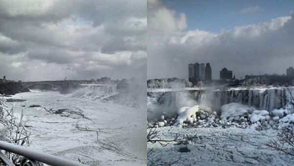 இப்படி குளிரின் துயரம் நீடித்துக்கொண்டே இருக்கிறது. இது ஒருபுறம் இருக்க உலக புகழ்மிக்க நயகரா அருவி இந்தகுளிரால் அப்படியே உறைந்து நின்று விட்டது. ஆம் இது உண்மைதான். செவ்வாய்க்கிழமை இரவு கனடா மற்றும் அமெரிக்காவில் ஏற்பட்ட மிகக் குறைந்த வெப்பநிலை காரணமாக பாய்ந்தோடி விழுந்து கொண்டிருந்த நயாகரா நீர்வீழ்ச்சி நின்று போனது. ஆம்.. நீர்வீழ்ச்சியின் ஒரு பகுதி அப்படியே உறைந்துபோய் நின்றுவிட்டது.