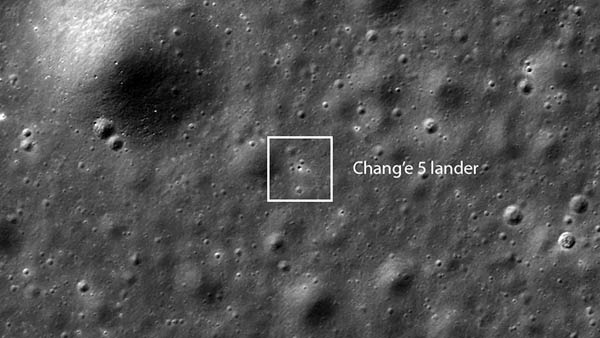 வெற்றிகரமாக தரை இறங்கியது. பின்னர் நிலவில் இருந்து பாறை துகள்களை சேகரித்து மீண்டும் பூமிக்கு வந்து கொண்டு இருக்கிறது. இந்த நிலையில் சேஞ்ச் 5 விண்கலம் நிலவில் தரை இறங்கியதை நாசாவின் சந்திர மறுமதிப்பீட்டு ஆர்பிட்டர் படம் பிடித்துளளது. நாசா வெளியிட்ட படத்தில் நிலவின் மேற்பரப்பில் தரை இறங்கி இருக்கும் சேஞ்ச் 5 விண்கலம் ஒரு சிறு புள்ளி போல் தெரிகிறது.
