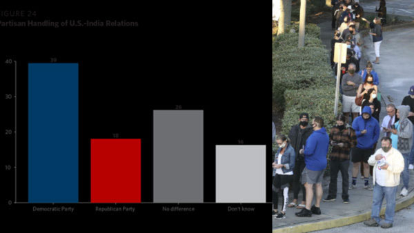 அதேபோல சீனாவுடன் மோதல் போக்கு ஏற்பட்டுள்ள நிலையில், இந்திய ராணுவத்தை வலுப்படுத்த அமெரிக்க எடுத்து வரும் நடவடிக்கைகளுக்கு அங்குள்ள ஜனநாயகக் கட்சியைச் சேர்ந்த இந்திய அமெரிக்கர்களைவிட குடியரசு கட்சியைச் சேர்ந்தவர்கள் அதிக ஆதரவு அளித்துள்ளனர். பொதுவாகவே, அமெரிக்க மக்களைவிட அமெரிக்க வாழ் இந்தியர்கள் சீனாவுக்கு எதிரான நிலைப்பாட்டையே அதிகம் எடுத்தனர்.