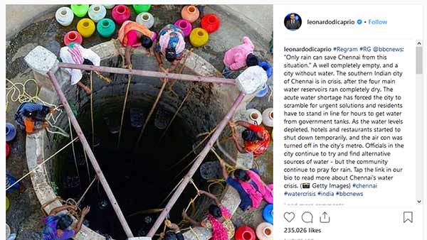 அந்த வகையில் பிபிசியில் சென்னையில் தண்ணீர் பஞ்சம் குறித்தும் எந்தளவுக்கு தண்ணீர் பஞ்சம் என்பதை படம் மூலம் தெரிந்து கொள்ளும் அளவிலான ஒரு புகைப்படமும் வெளியானது. இதை பார்த்த டைட்டானிக் படத்தின் ஹீரோ லியோனார்டோ டிகாப்ரியோ கவலை கொண்டுள்ளார்.