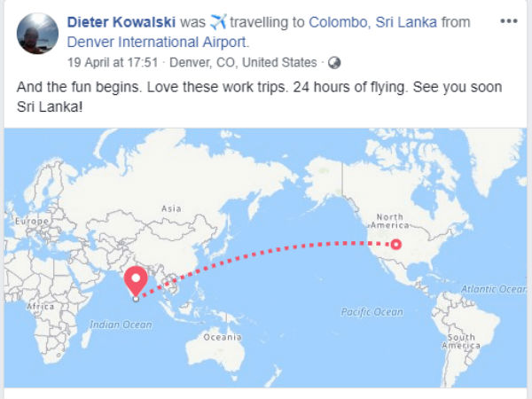 முன்னதாக தனது பேஸ்புக் பக்கத்தில், அவர் ஒரு ஸ்டேடஸ் வெளியிட்டுவிட்டு அமெரிக்காவிலிருந்து கிளம்பியிருந்தார். அதில், சந்தோஷம் தொடங்கிவிட்டது. இதுபோன்ற பணி ட்ரிப்புகளை விரும்புகிறேன். 24 மணி நேர விமான பயணம். விரைவில் உன்னை பார்க்கிறேன், ஸ்ரீலங்கா. இவ்வாறு டயேட்டர் கோவல்ஸ்கி தனது ஸ்டேடசில் தெரிவித்திருந்தார்.