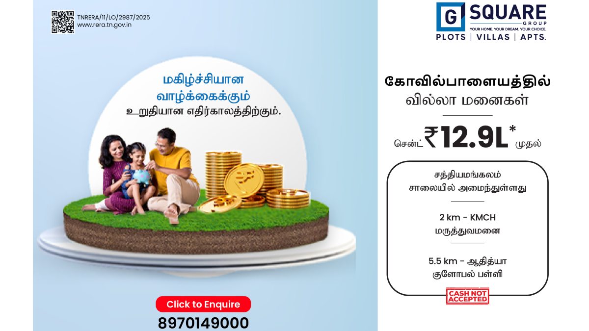 நம்பமுடியாத விலையில்.. கோவை கோவில்பாளையத்தில் அட்டகாசமான வீட்டு மனைகள்! ஜி ஸ்கொயரின் அதிரடி ஆஃபர்