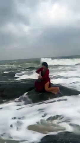 அப்போது கடல் அலைகள் வந்தன. எனினும் அதை பொருட்படுத்தாமல் அலையில் நனைந்தபடியே ஆடிக் கொண்டிருந்தார். ஒரு கட்டத்தில் அவர் பாறையில் உட்கார்ந்தபடியே ஒரு நடன அசைவை மேற்கொளளும் போது பெரிய அலை வந்தது. அதில் அவர் சிக்கினார். பின்னர் சுதாரித்து எழுந்தார்.