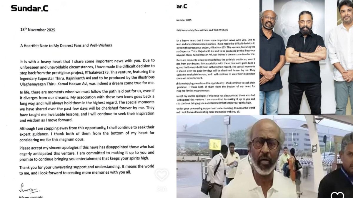 சென்னை: தமிழ் சினிமாவின் பிக் ப்ராஜெக்ட்களில் ஒன்றான, சூப்பர் ஸ்டார் ரஜினிகாந்த் நடிக்க, உலக நாயகன் கமல்ஹாசன் தயாரிக்கும் #Thalaivar173 திரைப்படத்திலிருந்து, இயக்குநர் சுந்தர். C விலகிவிட்டார்! (நவம்பர் 13) இன்று அவர் வெளியிட்ட ஓர் உருக்கமானக் கடிதத்தில் இந்த முடிவை அதிகாரப்பூர்வமாகத் தெரிவித்திருக்கிறார்.