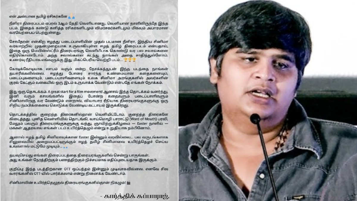 சென்னை: தமிழ் சினிமா ரசிகர்களுக்கு வேண்டுகோள் வைக்கும் வகையில் இயக்குநர் கார்த்திக் சுப்புராஜ் வெளியிட்டிருக்கும் பதிவு தற்போது பரபரப்பை ஏற்படுத்தியுள்ளது. குறிப்பாக அவர் இயக்குனராக இணைந்துள்ள "நீளிரா" படத்தை மையமாக வைத்து, தனது மனதில் இருந்ததை மிகவும் திறந்த மனதுடன் பகிர்ந்துள்ளார்.