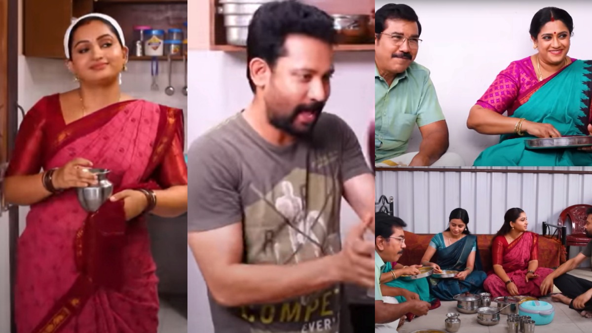 அதைத்தொடர்ந்து அடுத்த நாள் காலையில் விடிந்ததும் வசு எல்லோருக்கும் டீ போட்டு கொடுக்கின்றார். அதை குடித்து பார்த்த கார்த்திக்கும், நடேசனும் கிண்டலடித்துக் கொண்டிருக்கின்றனர். அந்த நேரத்தில் வெளியே சென்று இருந்த தமிழ் கையில் இரண்டு ஷாப்பிங் பையை தூக்கிக் கொண்டு வருகிறார். அந்த நேரத்தில சரஸ்வதி கையில் சொம்பு ஒன்றை தூக்கிக் கொண்டு வர அதை பார்த்து தமிழ் வெயிட் தூக்காத என்று கத்த, அதற்க்கு வசு, இந்த சின்ன சொம்பு உங்களுக்கு வெயிட்டா என்று கிண்டல் பண்ணுகிறார்.
