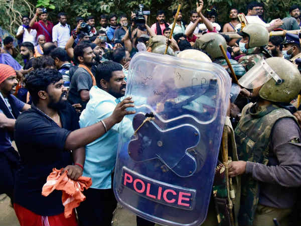 கொல்லத்தில் இந்து அமைப்பினர் சாலையில் அமர்ந்து போராட்ட செய்ய முயன்றதற்கு போலீசார் எதிர்ப்பு தெரிவித்தனர். இதனால் போலீசார் மற்றும் போராட்டக்கார்கள் இடையே வாக்குவாதம் ஏற்பட்டது. இந்த வாக்குவாதம் தற்போது வன்முறையில் முடிந்துள்ளது.
