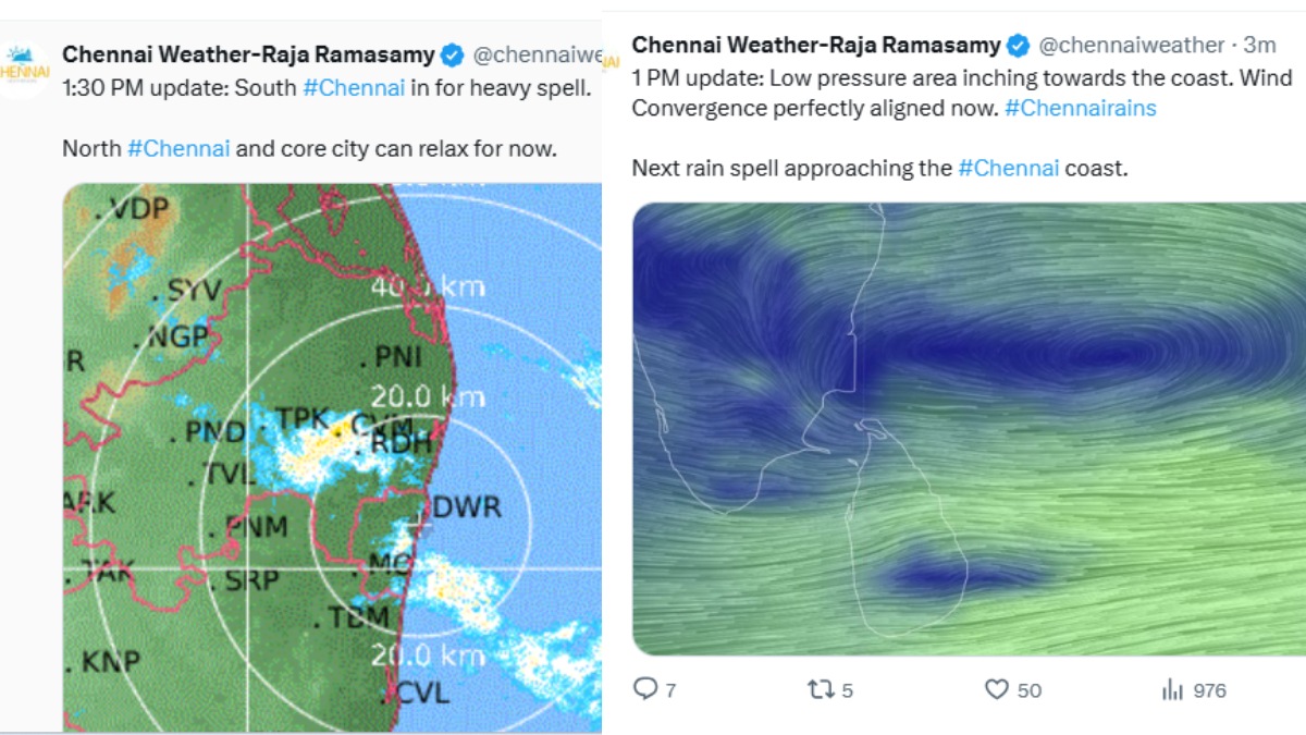 1.30 மணி நிலவரப்படி, தென்சென்னை பகுதி முழுவதும் மிக கனமழை பெய்து வருகிறது. வடசென்னை மற்றும் சென்னையின் உள்பகுதிகளில் கொஞ்சம் ஓய்வு கிடைத்துள்ளது என்று கூறினார். வானிலை ஆய்வாளர் ராஜா ராமசாமி வெளியிட்ட மற்றொரு பதிவில், இந்திய வானிலை ஆய்வு மையம், ஆரஞ்சு அலர்ட்டை இன்று ரெட் அலர்ட் நிலைக்கு மாற்றி உள்ளது. ஏனெனில் காற்றழுத்த தாழ்வு நிலை சென்னை கடற்கரைக்கு அருகில் நகர்ந்து வருகிறது. மழை மேகங்கள் தொடர்ந்து உருவாகிக்கொண்டே இருக்கிறது" என்று கூறியுள்ளார்.